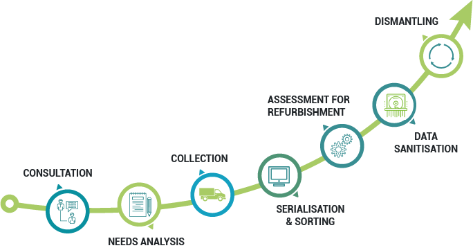 E-waste management includes consultation, needs analysis, collection of e-waste, serialisation of the items at client's site or on our site, sorting, assessment for refurbishment, data sanitisation and dismantling. The aim of e-waste management is to clean up the environment by diverting e-waste from landfill.